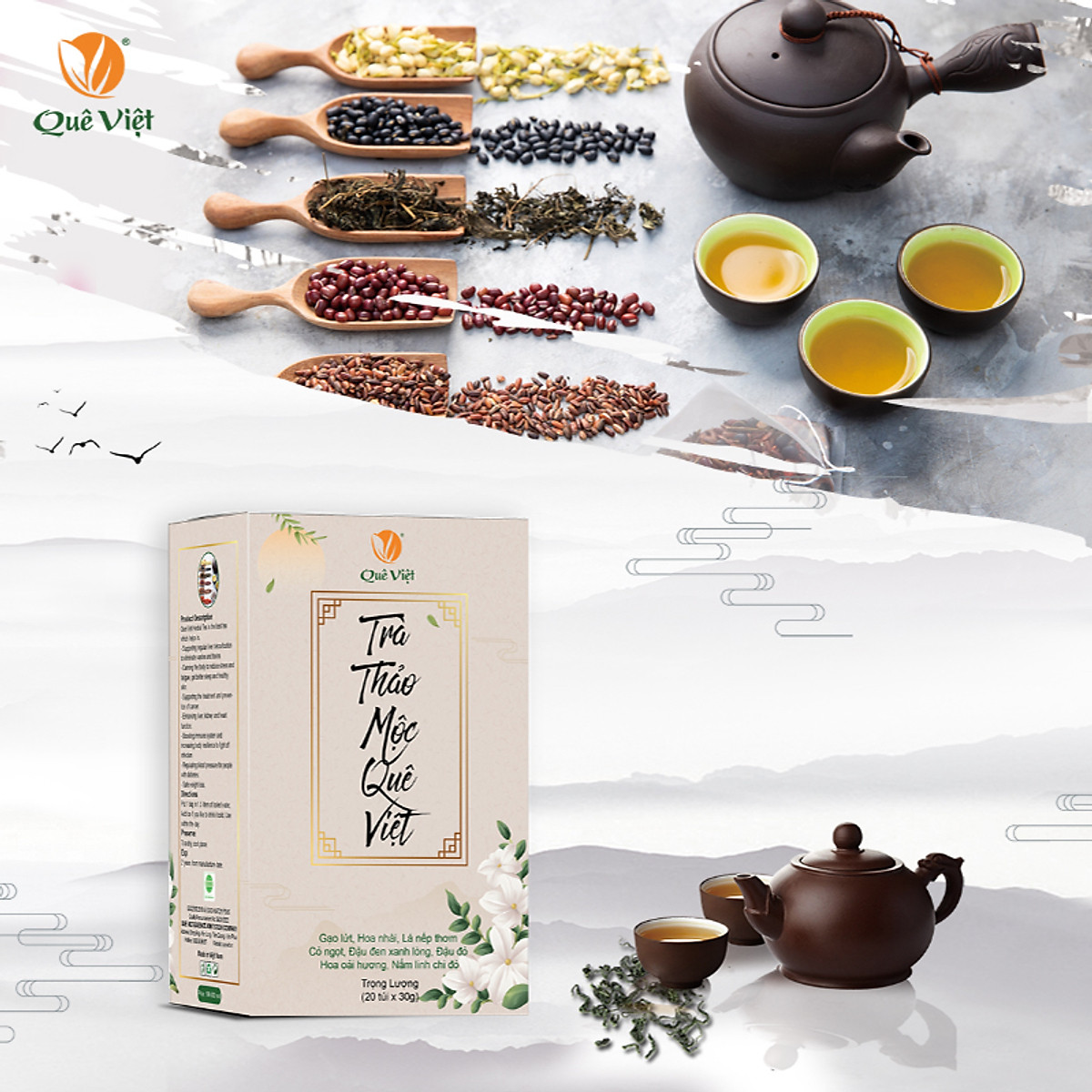Que Viet herbal tea bags support detoxification and cool the liver, extracted entirely from natural herbs, with a cool, fragrant flavor extracted from brown rice. green black beans, red beans, lavender, jasmine, stevia, red lingzhi mushrooms, sticky leaves.